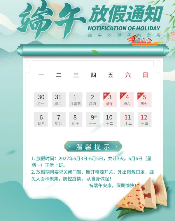 根據(jù)國務(wù)院辦公廳通知精神并結(jié)合公司實際,現(xiàn)將2022年端午節(jié)放假安排通知如下:6月3日(星期五)至6月5日(星期日)放假,共3天。請大家提前安排好工作生活,節(jié)日期間注意安全,減少人員聚集,加強(qiáng)個人防護(hù),度過一個平安、祥和的節(jié)日假期。提前祝大家端午節(jié)安康!